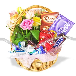 Маленькая сластена - подарочная корзина с цветами и сладостями
