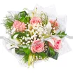 Уменьшенный: роза розовая - 3 шт, лилия белая - 1 шт, гипсофила - 1 шт, аспарагус - 1 шт, декоративная зелень, лист аспидистры загнутый - 3 шт, сетка белая. Примерный диаметр букета 25х25 см.