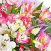 ДЕЛЮКС: эустома розовая - 6 шт., эустома фиолетовая - 6 шт., эустома белая - 5 шт., альстромерия розовая - 11 шт., альстромерия белая - 5 шт.,фетр светло-фиолетовый. Примерный диаметр букета 50х50 см.