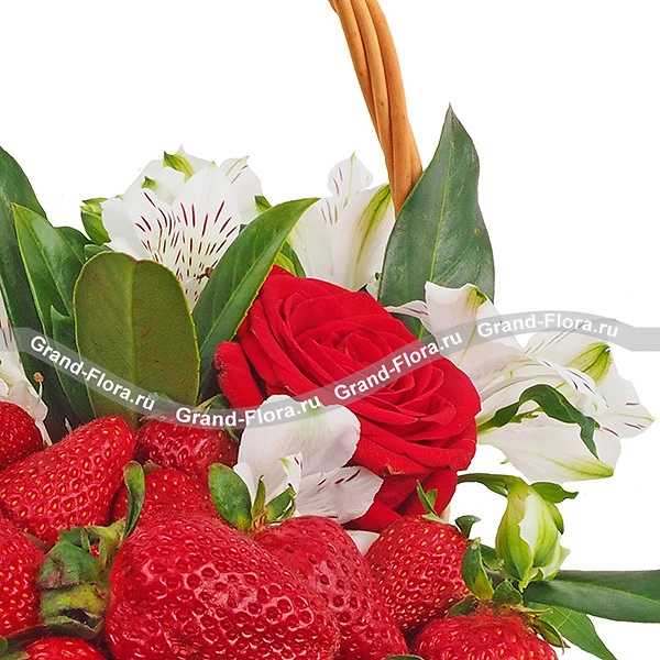 ЛЮКС: клубника - 2 кг, альстромерия белая - 4 шт, роза красная - 1 шт, оазис - 0,5, корзинка.