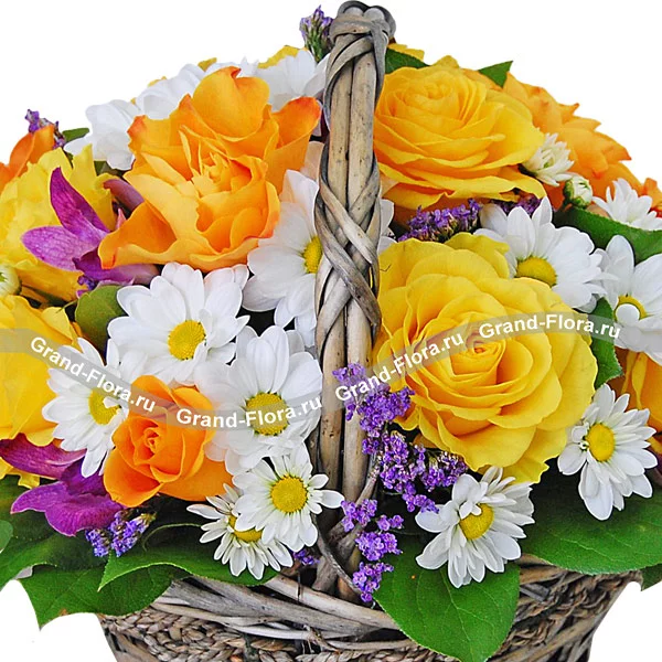 Уменьшенный: роза желтая - 5 шт, хризантема кустовая ромашковая (белая) - 3 шт, альстромерия фиолетовая - 1 шт, статица - 1 шт, декоративная зелень, оазис, корзина.