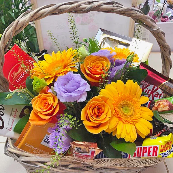 Уменьшенный: Snikers - 1 шт., Mars - 1 шт., Twix - 1 шт., конфеты "Ferrero Rocher" - 1 шт., шоколад "DOVE" - 1 шт., шоколад "Ritter sport" - 1 шт., конфеты "Lindor" - 1 шт., роза - 2 шт., эустома - 1 шт., герберы - 3 шт., декоративная зелень, оазис, декор, средняя корзина.