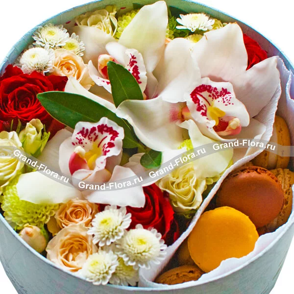 Стандартный (на фото): роза красная - 3 шт., роза кустовая кремовая - 1шт., хризантема белая мелкоцветная - 1 шт., орхидея белая - 3 шт., оазис, макарунс - 8 шт., фетр белый, коробка круглая (20х20см).