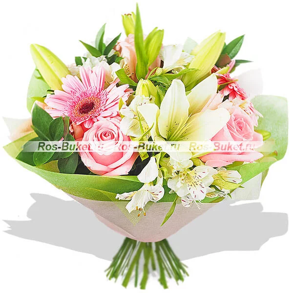 ЛЮКС: гербера розовая - 6 шт, лилия белая - 3 шт, роза розовая - 11 шт, альстромерия белая - 6 шт, рускус, фетр зеленый.