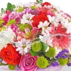 Роза розовая - 5 шт., роза белая - 5 шт., роза красная - 6 шт., гербера розовая - 3 шт., гербера малиновая - 4 шт., хризантема кустовая (белая и розовая) - 7 шт., хризантема кустовая зеленая - 4 шт., хризантема одноголовая белая - 3 шт.,  альстромерия (белая и розовая) - 4 шт.,   статица - 3 шт., фетр фиолетовый.