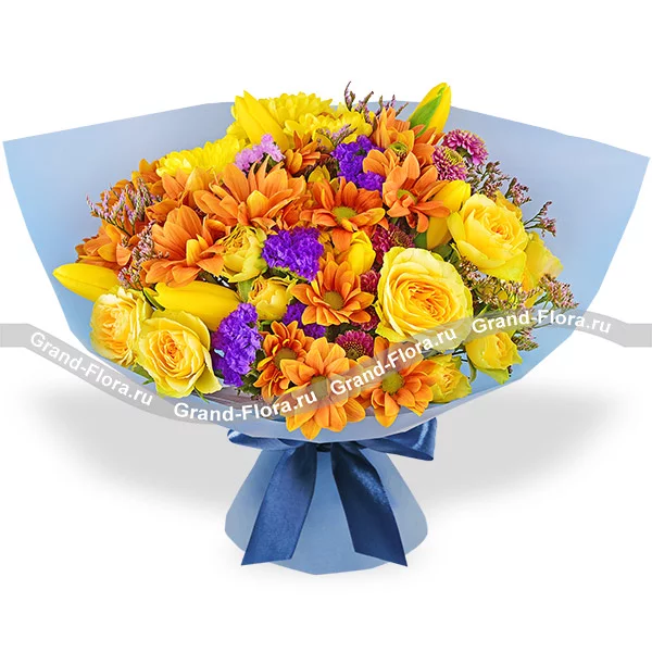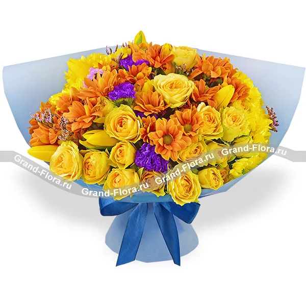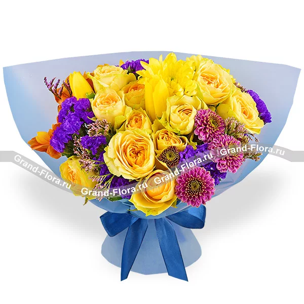 Люкс: роза кустовая желтая - 6 шт., хризантема кустовая желтая - 3 шт., хризантема кустовая фиолетовая - 2 шт., тюльпан желтый - 9 шт., хризантема кустовая оранжевая - 3 шт., статица, лимониум, упаковка, лента. Примерный размер: 45Х45 см.