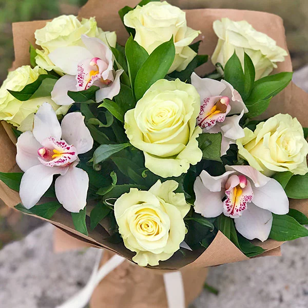 Стандартный: роза белая - 7 шт., орхидея - 4 шт., декоративная зелень, коробка упаковка крафт.